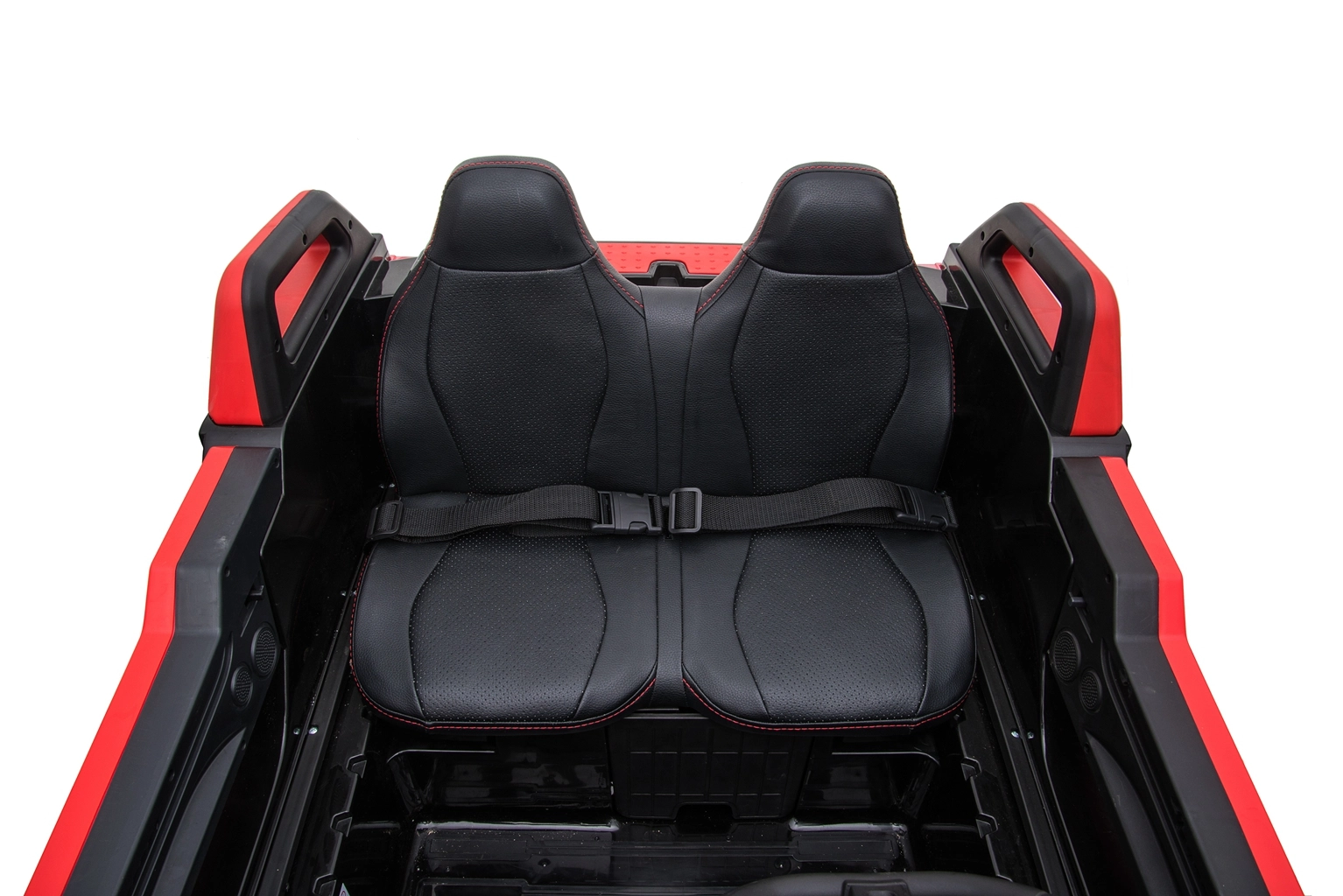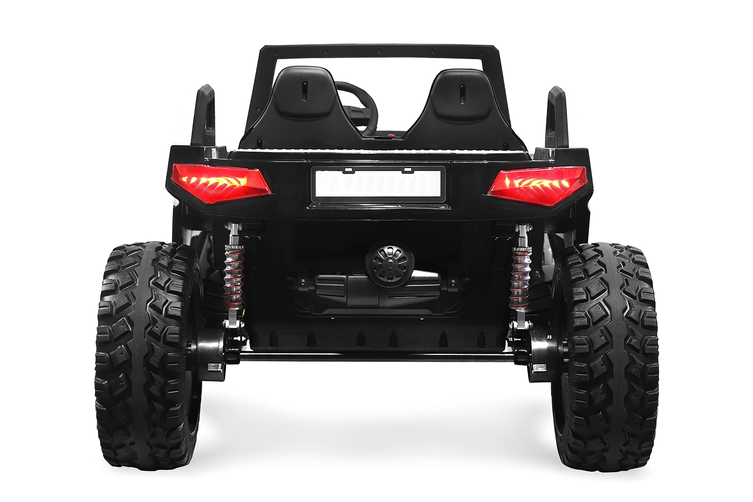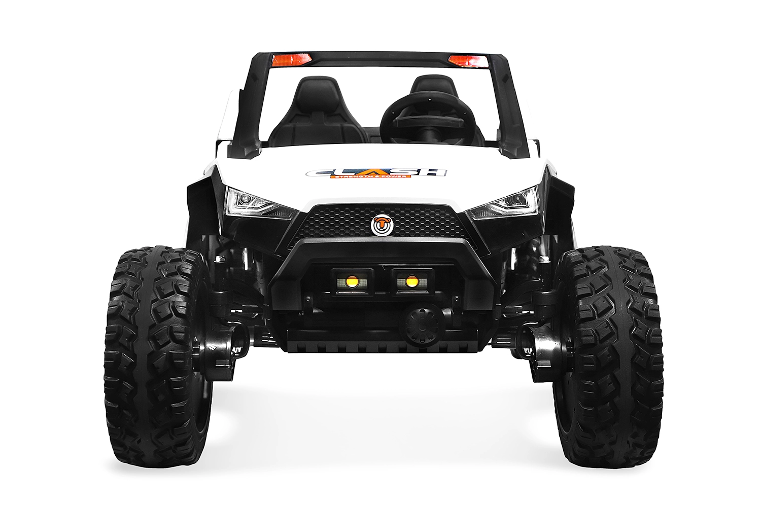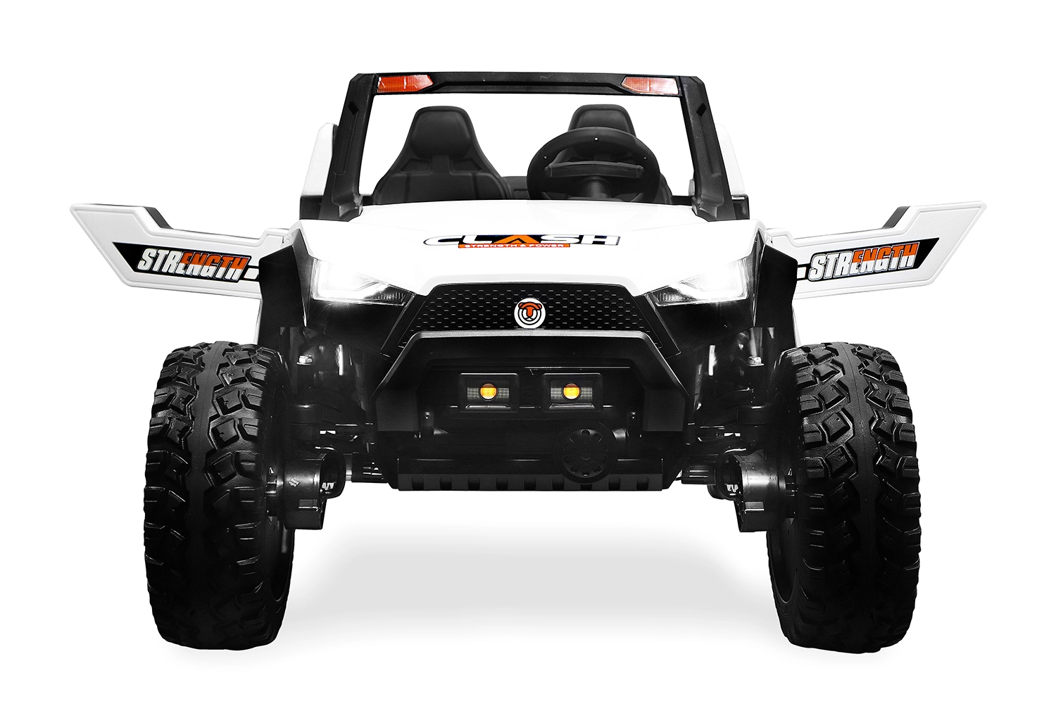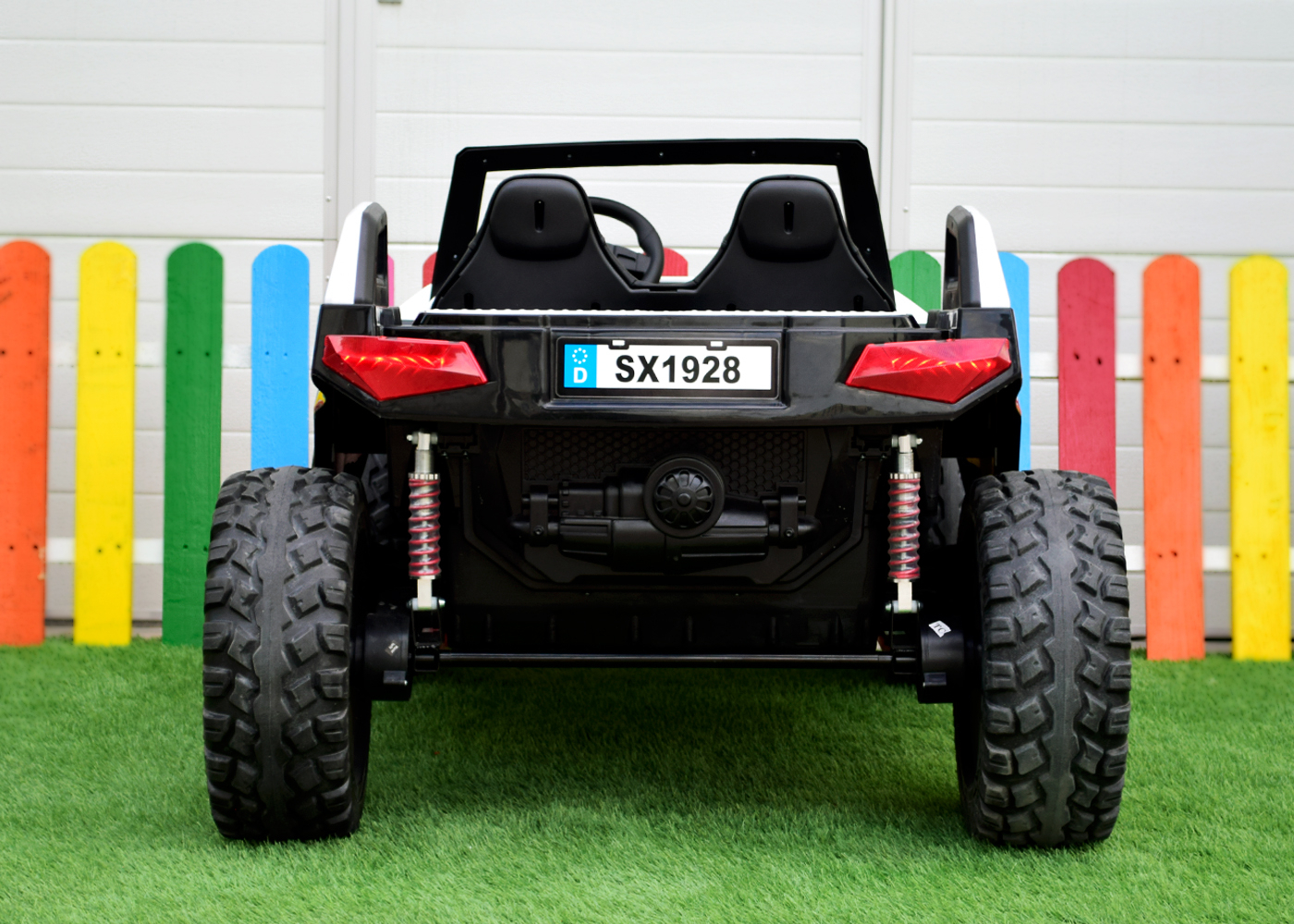 The white BJX1928/SX1928 electric UTV is intended for children between 3 and 12 years old, it has premium equipment that consists of soft EVA rubber wheels, a seat upholstered with ecological leather and a music player with ports for various connections. It has 4 motors of 75W each, totaling a power of 300W, 4x4 traction and the seat is adjustable and can support up to 4 children. In addition, there is an extra seat that can be converted for an adult so that you can guide the car and assist the little one closely.