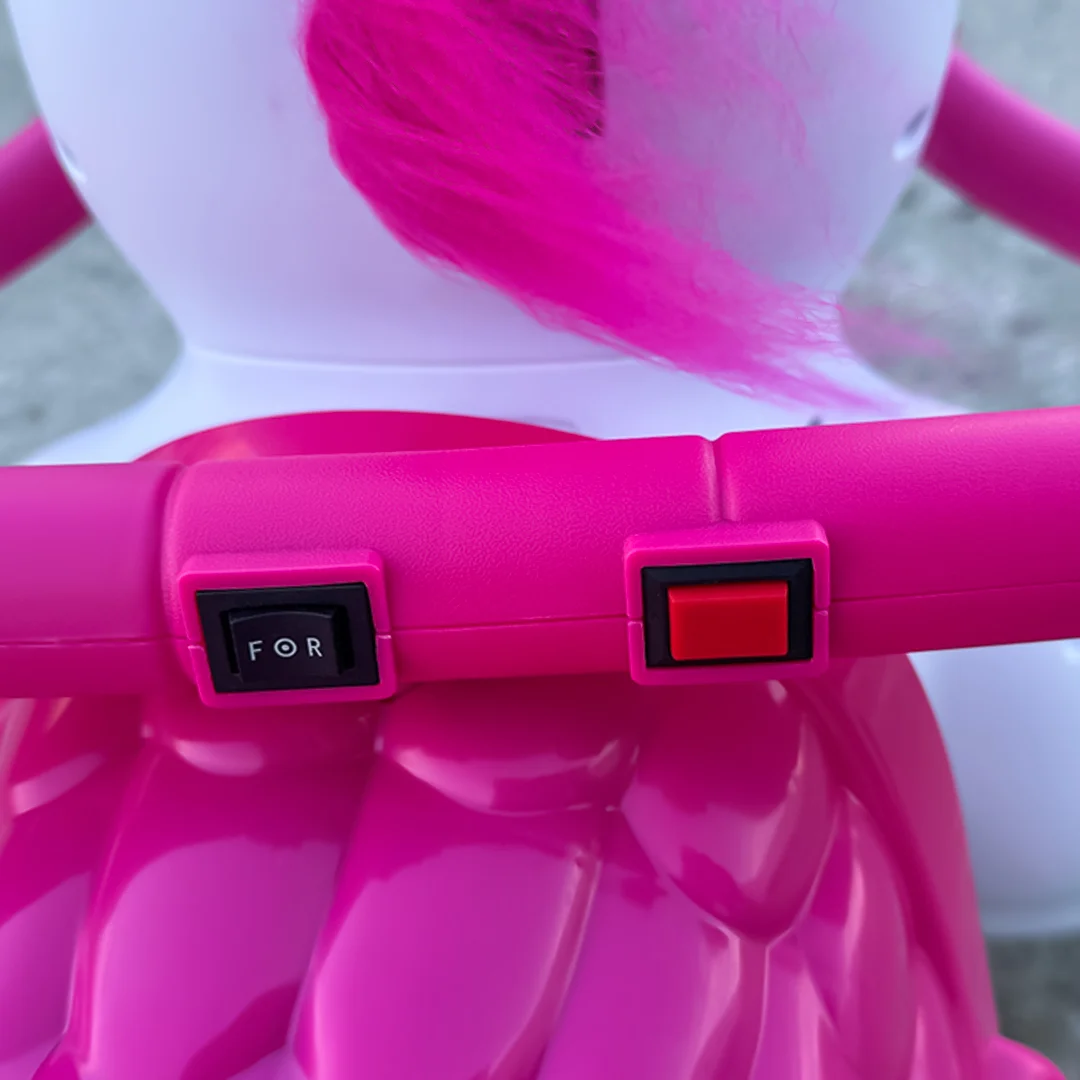 Built on a stable 4-wheel structure, the ride-on horse is equipped with two 35W electric motors (12V), ensuring smooth and controlled movement. Children can switch between forward and reverse using the dedicated selector, while the acceleration and braking button allows intuitive and safe operation. The support handle provides extra stability and helps maintain control during riding.