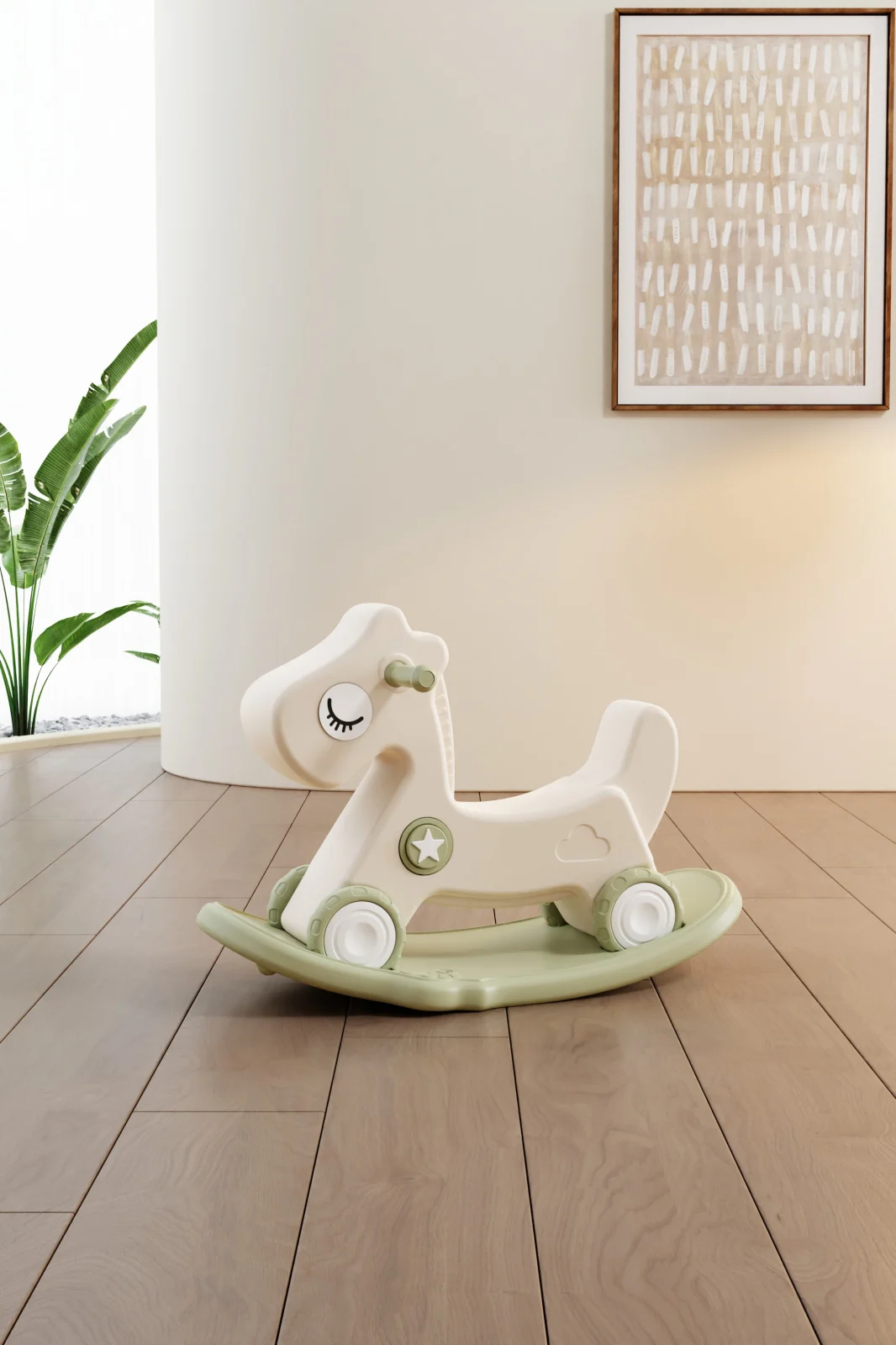 Balansoarul și premergătorul multifuncțional pentru copii este realizat din HDPE (polietilenă de înaltă densitate), un material recunoscut pentru rezistența și siguranța sa. Designul său prietenos, în formă de căluț, este completat de detalii simpatice, precum ochii închiși și o stea decorativă.